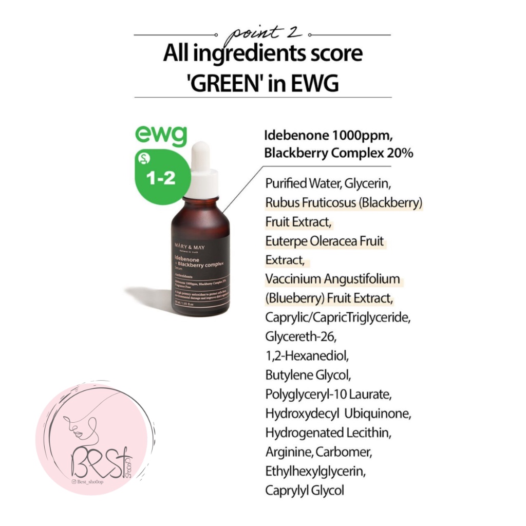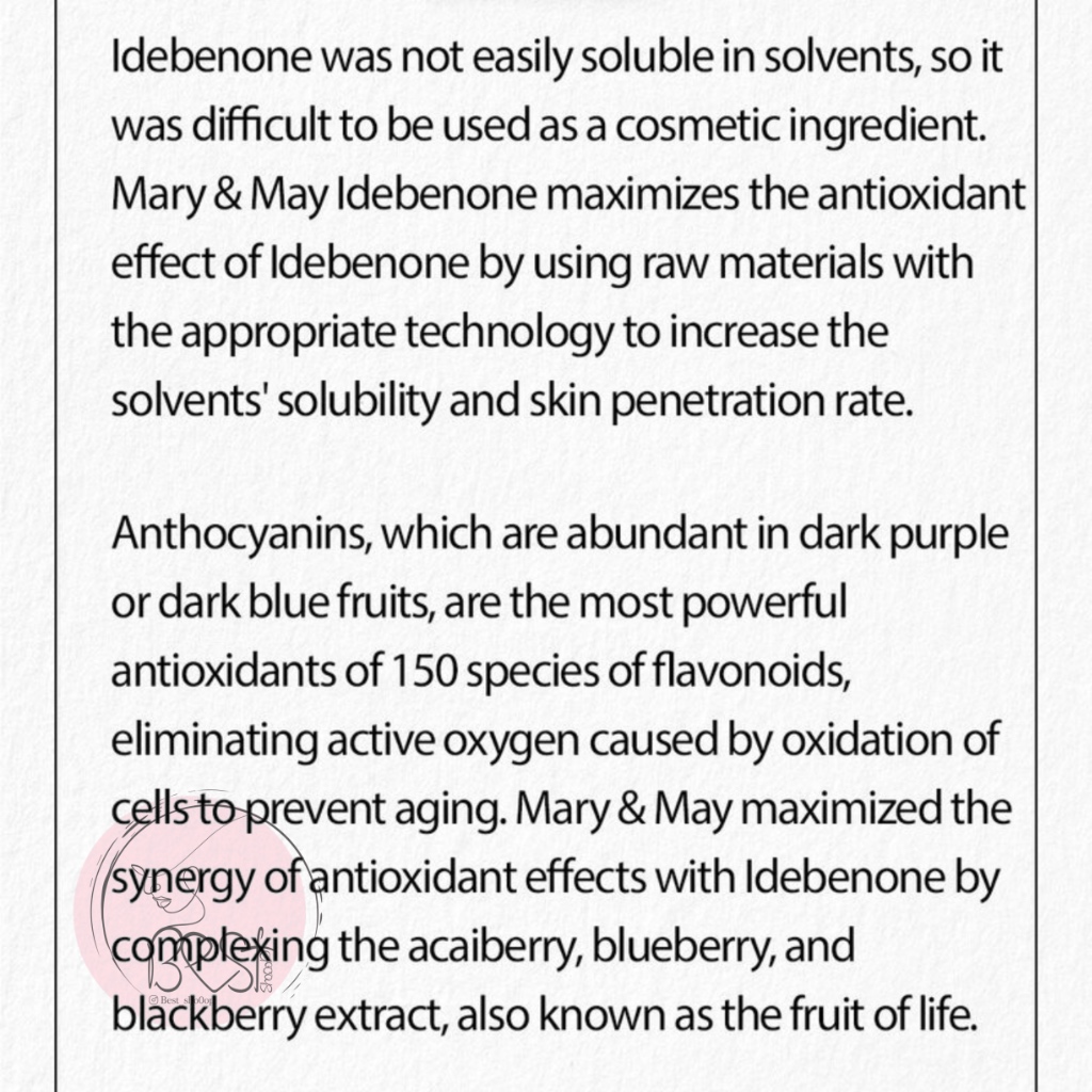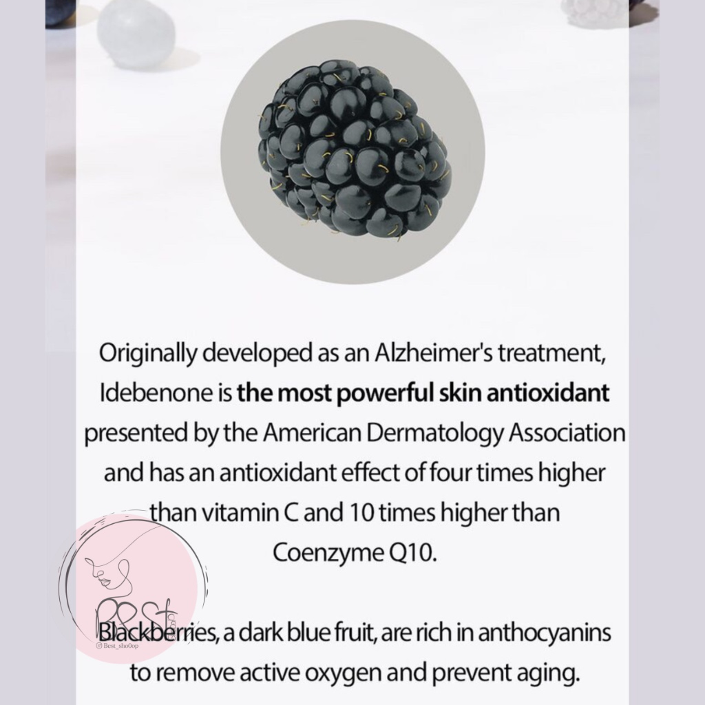 🙋🏻‍♀️ Idebenone از لحاظ قدرت آنتی‌اکسیدانی ۴ برابر ویتامین C و ۱۰ برابر کوآنزیم Q10 می‌باشد. 🙋🏻‍♀️ Blackberry سرشار از آنتی‌اکسیدان، anthocyanins و ویتامین C است و می‌تونه اکسیژن فعال رو از بین ببره و از پیری پوست جلوگیری کنه.