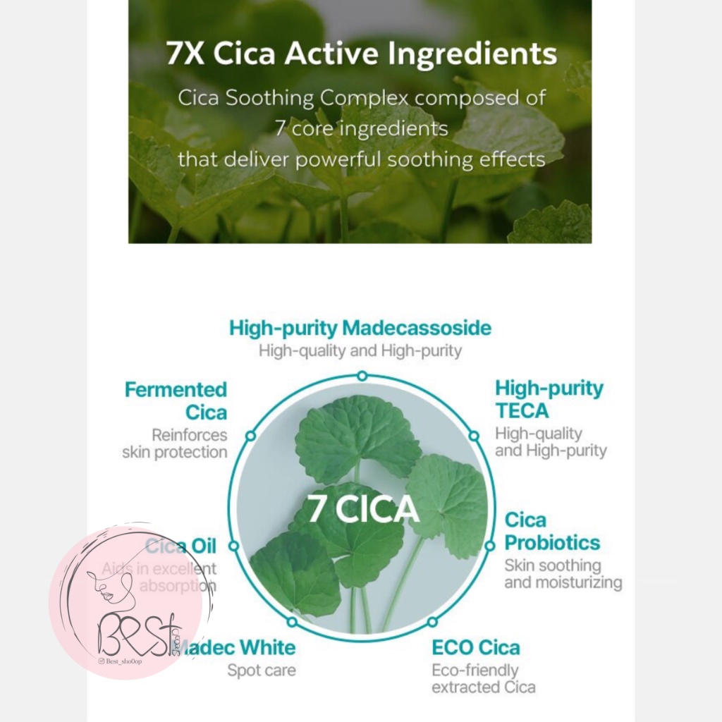 4. Cica soothing complex with 7 essential ingredients (high-purity madecassoside, high-purity TECA, ECO cica, cica probiotics, made white, cica oil, fermented cica)⁃ ( آبرسانی، تقویت سددفاعی پوست، ضدقرمزی، التیام بخش التهابات پوستی، افزایش گردش خون، جلوگیری از پیری زودرس سلولهای پوستی، بازسازی و بهبود حالت ارتجاعی پوست )