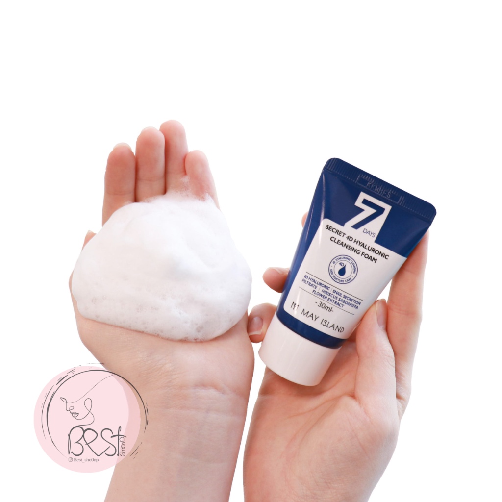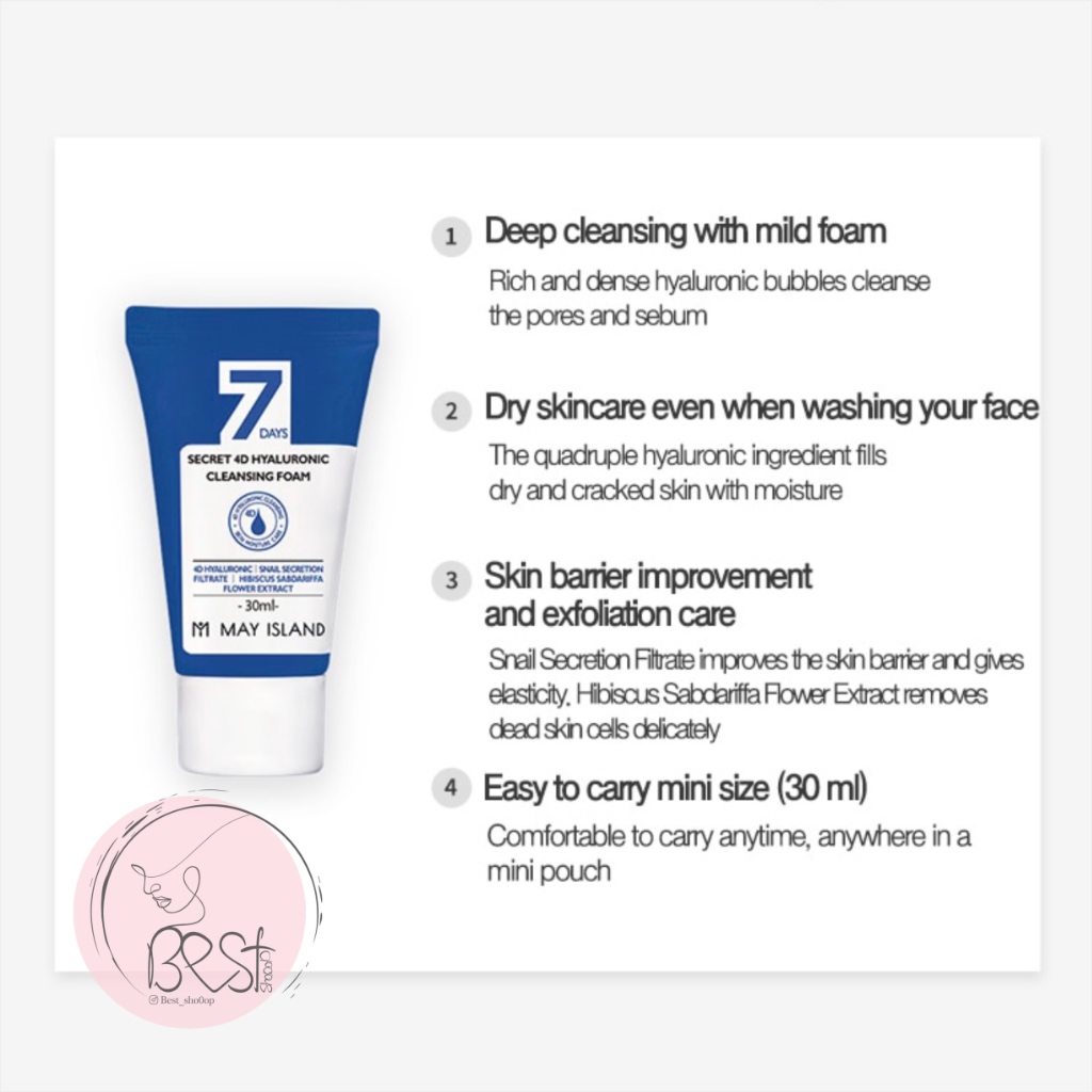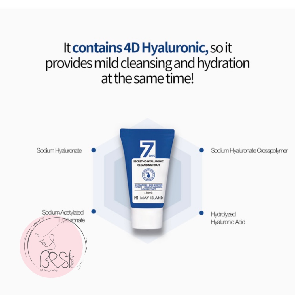 Ingredients : Purified Water, Palmitic Acid, Stearic Acid, Sodium Laureth Sulfate, Glycerin, Potassium Hydroxide, Myristic Acid, Lauric Acid, Cocamide MEA, Propylene Glycol, Centella Asiatica Extract (2,000ppm), Phenoxyethanol, Sodium Hyaluronate, Fragrance, Chrysanthellum Indicum Extract, Propylparaben , Chamomilla Recutita (Matricaria) Flower/Leaf/Stem Extract, Aloe Barbadensis Leaf Extract, Melaleuca Alternifolia (Tea Tree) Extract, Chaenomeles Sinensis Fruit Extract, Camellia Sinensis Leaf Extract, Salicylic Acid 2. ▪️▪️ May island – 7 Days Secret 4D Hyaluronic Cleansing Foam 1. در این شوینده ۴ ماده اولیه کلیدی وجود داره ( 4D hyaluronic acid, Snail filtrate, Hibiscus flower extract, Centella asiatica extract, Chamomile extract )