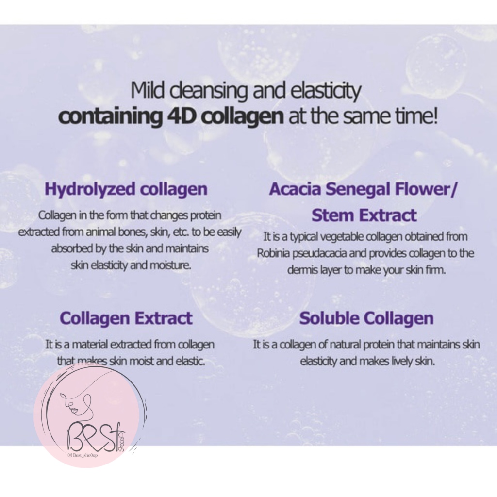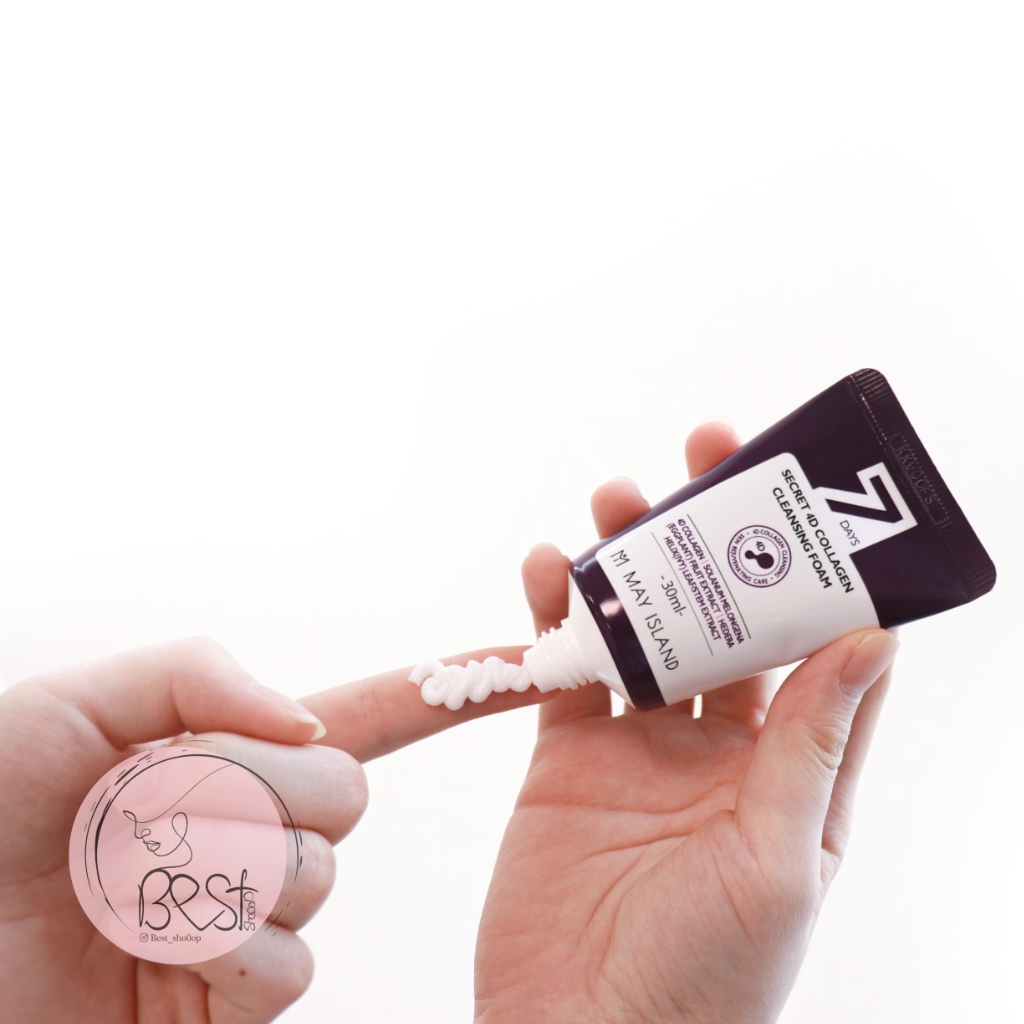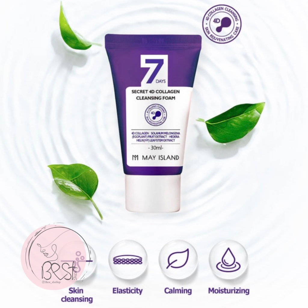 Ingredients : Glycerin, Purified Water, Myristic Acid, Stearic Acid, Potassium Hydroxide, Lauric Acid, Niacinamide, PEG-100 Stearate, Glyceryl Stearate, Cocamidopropyl Betaine, Potassium Cocoyl Glycinate, Sodium Cocoyl Glutamate, Sodium Hyaluronate, Butylene Glycol, Phenoxyethanol, Fragrance, Hippophae Rhamnoides Fruit Extract (1,000ppm), Citrus Limon (Lemon) Fruit Extract, Sodium Polyacrylate, Polyquaternium-7, Ethylhexylglycerin, Hibiscus Sabdariffa Flower Extract, Saururus Chinensis Extract, Opuntia Humifusa Extract, Camellia Sinensis Leaf Extract, Disodium EDTA, Adenosine, Panthenol 4. ▪️▪️ May island – 7 Days Secret 4D Collagen Cleansing Foam 1. میزان کلاژن موجود در پوست رو افزایش میده که برای پوست های شل و افتاده میتونه کمک بزرگی باشه