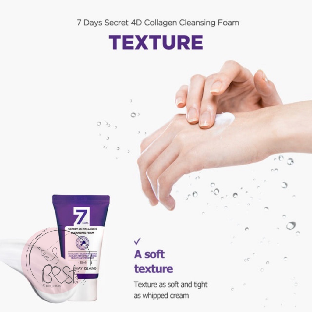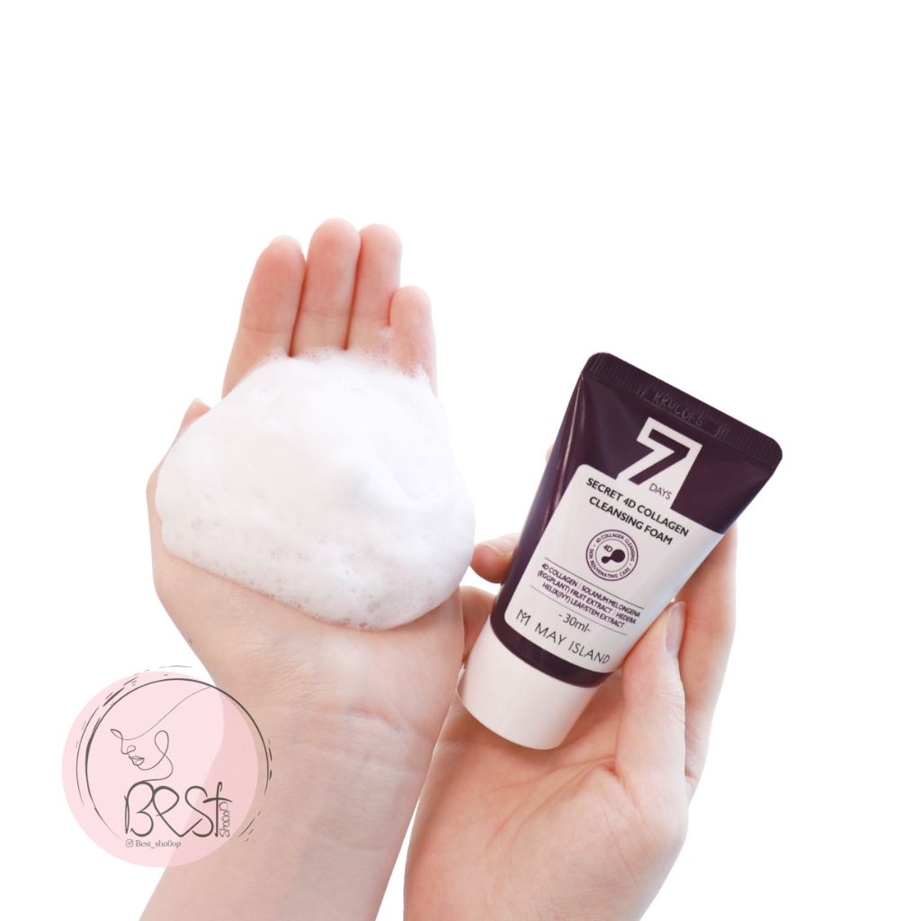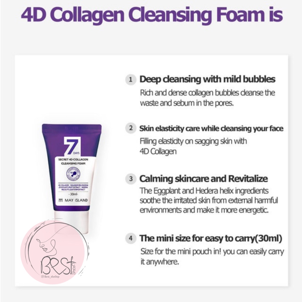 Ingredients : Glycerin, Purified Water, Myristic Acid, Stearic Acid, Potassium Hydroxide, Lauric Acid, Niacinamide, PEG-100 Stearate, Glyceryl Stearate, Cocamidopropyl Betaine, Potassium Cocoyl Glycinate, Sodium Cocoyl Glutamate, Sodium Hyaluronate, Butylene Glycol, Phenoxyethanol, Fragrance, Hippophae Rhamnoides Fruit Extract (1,000ppm), Citrus Limon (Lemon) Fruit Extract, Sodium Polyacrylate, Polyquaternium-7, Ethylhexylglycerin, Hibiscus Sabdariffa Flower Extract, Saururus Chinensis Extract, Opuntia Humifusa Extract, Camellia Sinensis Leaf Extract, Disodium EDTA, Adenosine, Panthenol 4. ▪️▪️ May island – 7 Days Secret 4D Collagen Cleansing Foam 1. میزان کلاژن موجود در پوست رو افزایش میده که برای پوست های شل و افتاده میتونه کمک بزرگی باشه