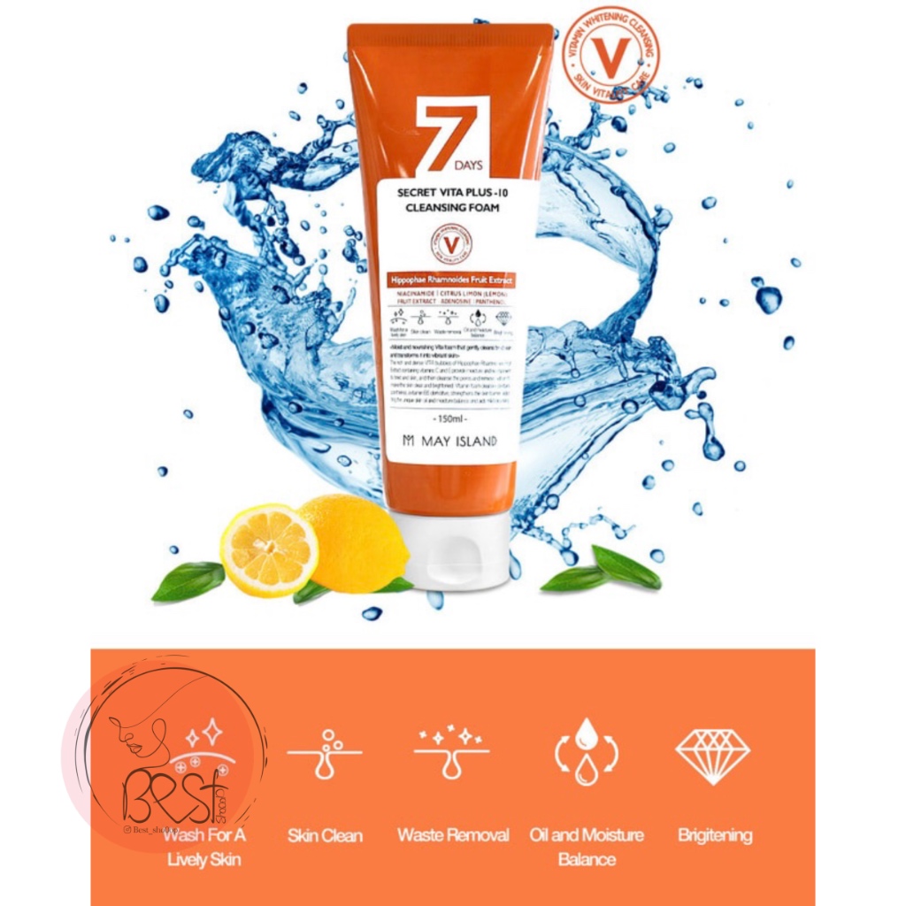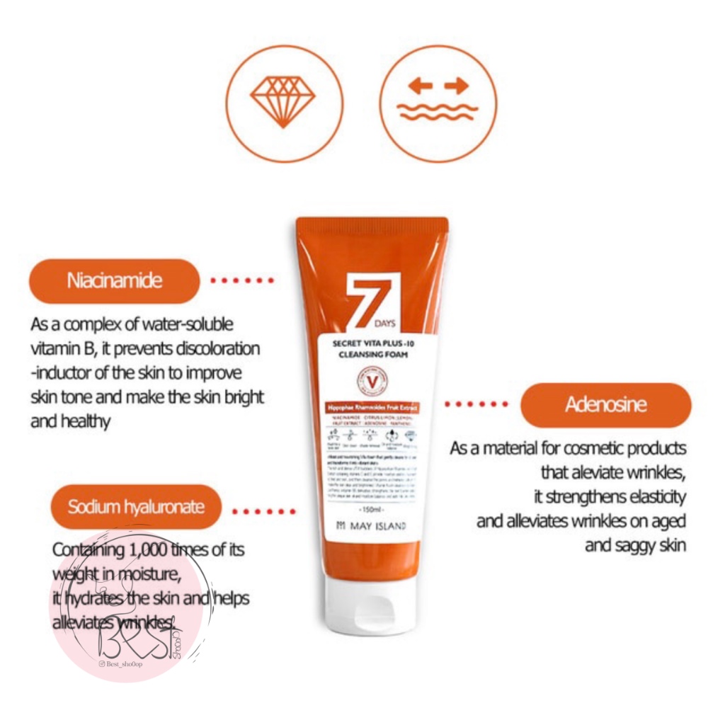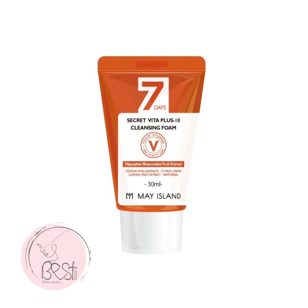Ingredients : Purified Water, Palmitic Acid, Stearic Acid, Sodium Laureth Sulfate, Glycerin, Potassium Hydroxide, Myristic Acid, Lauric Acid, Cocamide MEA, Propylene Glycol, Centella Asiatica Extract (2,000ppm), Phenoxyethanol, Sodium Hyaluronate, Fragrance, Chrysanthellum Indicum Extract, Propylparaben , Chamomilla Recutita (Matricaria) Flower/Leaf/Stem Extract, Aloe Barbadensis Leaf Extract, Melaleuca Alternifolia (Tea Tree) Extract, Chaenomeles Sinensis Fruit Extract, Camellia Sinensis Leaf Extract, Salicylic Acid 3. ▪️▪️ May island – 7 Days Secret Vita Plus-10 Cleansing Foam 1. این شوینده بدون ایجاد حساسیت پوست میتونه علاوه بر پاکسازی پوست ، به تغذیه و تنظیم سطح رطوبت و چربی پوست کمک زیادی بکنه