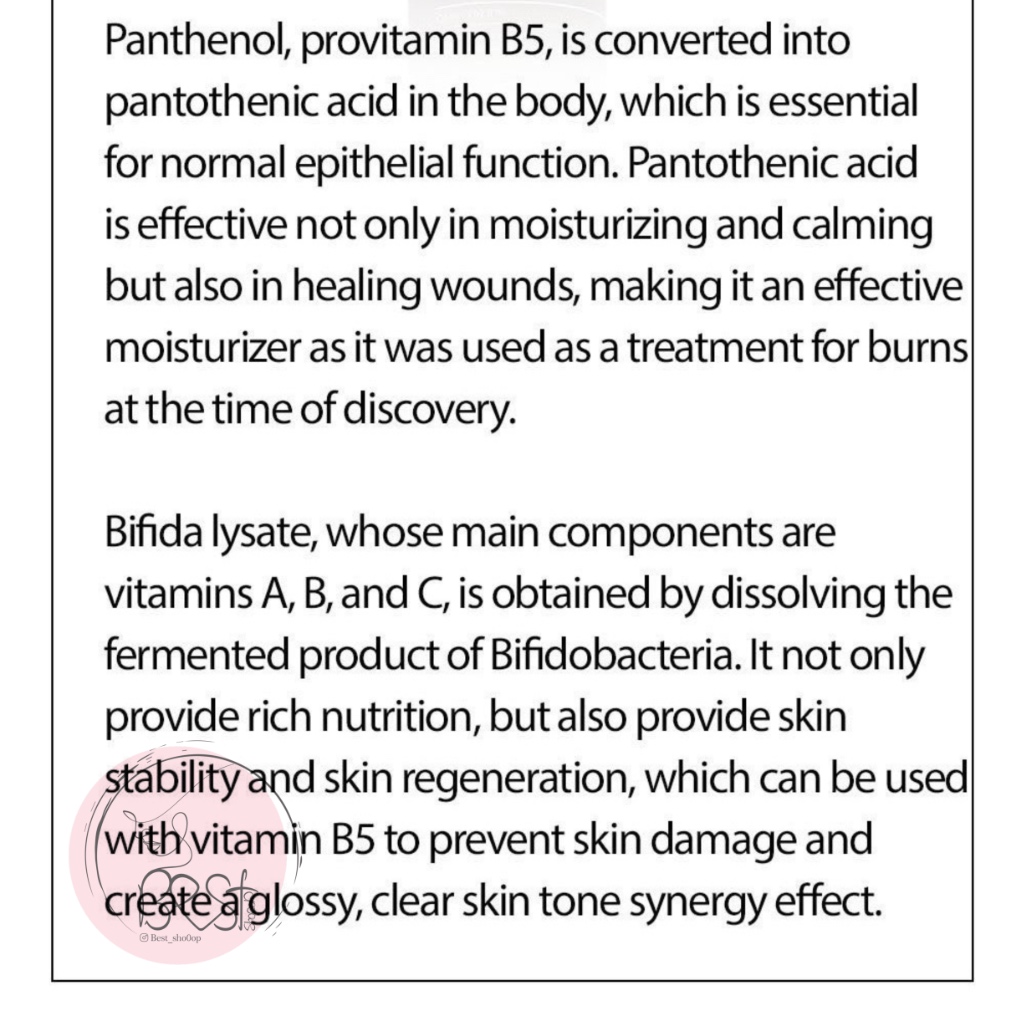 ساخت کره جنوبی تاریخ انقضا:۲۰۲۴/۱۰ ۱۲۰ میل می باشد Ingredients : Purified Water, Glycerin, Butylene Glycol, Bifida Ferment Lysate (30,000ppm), Niacinamide, Panthenol (1,000ppm), Glycereth-26, Dipropylene Glycol, Cetearyl Olivate, Sorbitan Olivate, Hydroxyacetophenone, Polyglyceryl-10 Laurate, Polyglyceryl-4 Laurate, Betaine, Caprylyl/Capryl Glucoside, 1,2-Hexanediol, Adenosine, Caprylyl Glycol, Disodium EDTA, Xanthan Gum, Fragrance, Sodium Hyaluronate