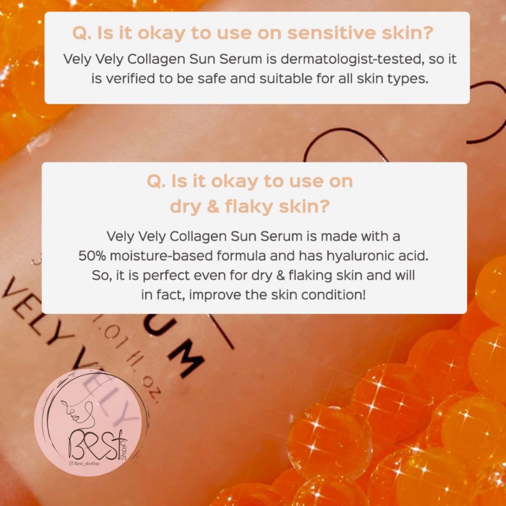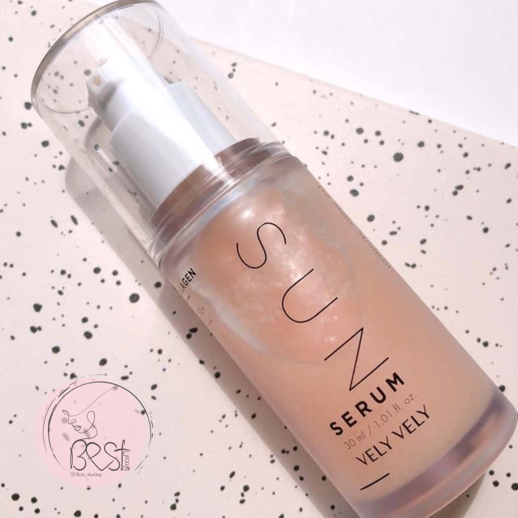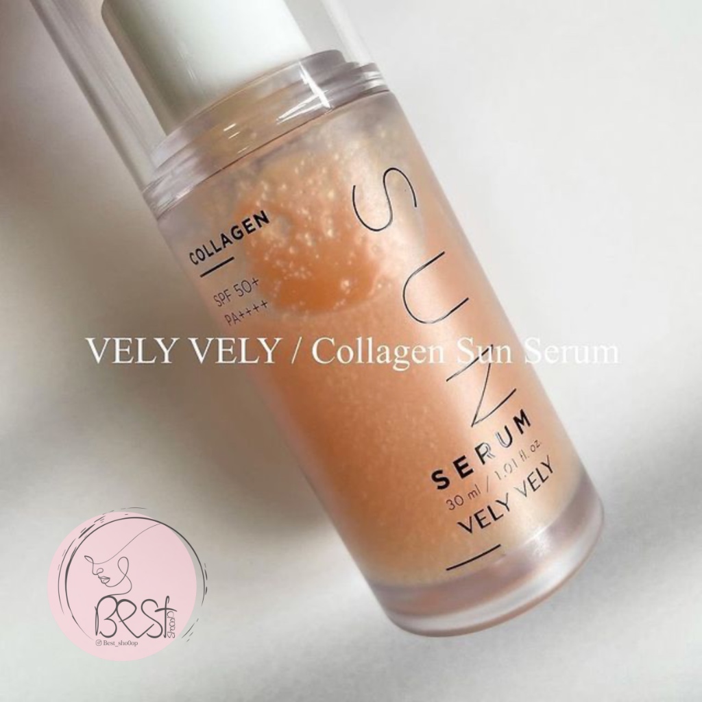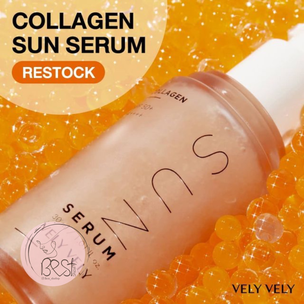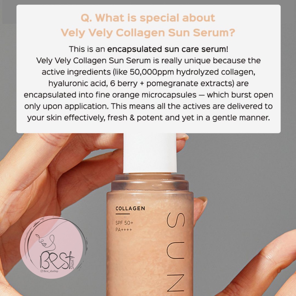 [VELY VELY] Collagen Sun Serum SPF 50+ PA++++ 30ml ▪️ مواد اولیه فعال بصورت کپسوله شده در این محصول وجود دارند تا بیشترین تاثیرگذاری و جذب رو داشته باشن ✨